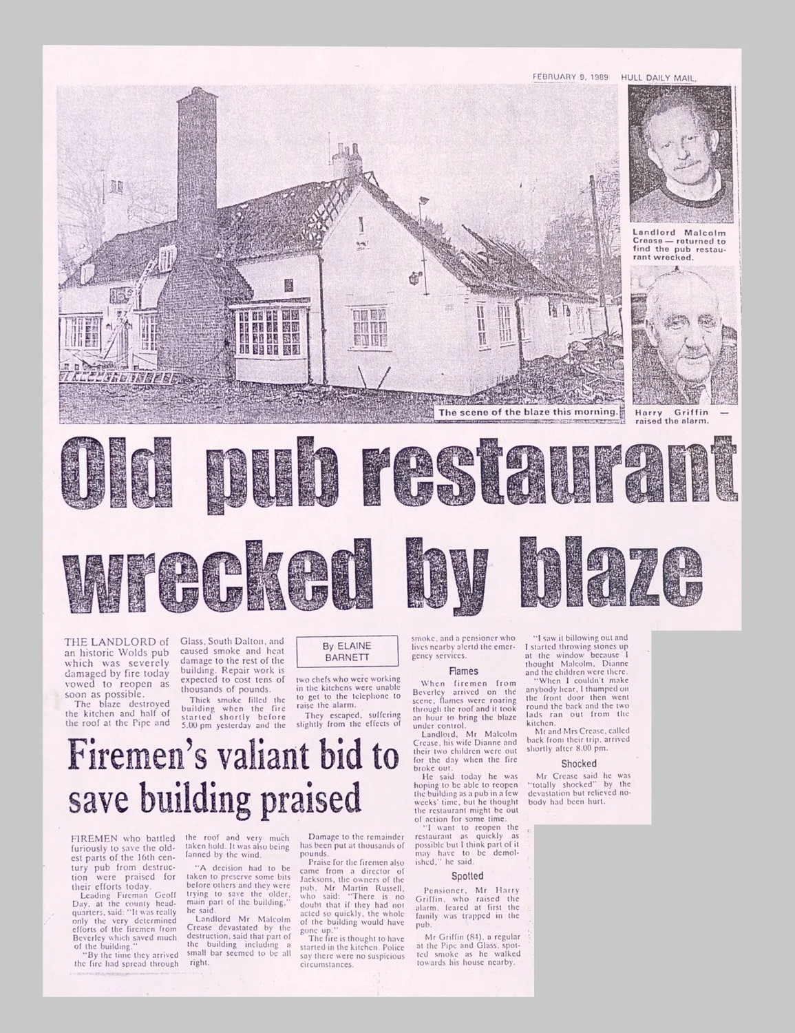 In February 1989, the pub was gutted by fire, causing tens of thousands of pounds worth of damage: two chefs on the premises at the time escape suffering only with minor smoke inhalation. The Jacksons sold the pub in the early 1990s, and over the next 15 years or so, it had several private owners.